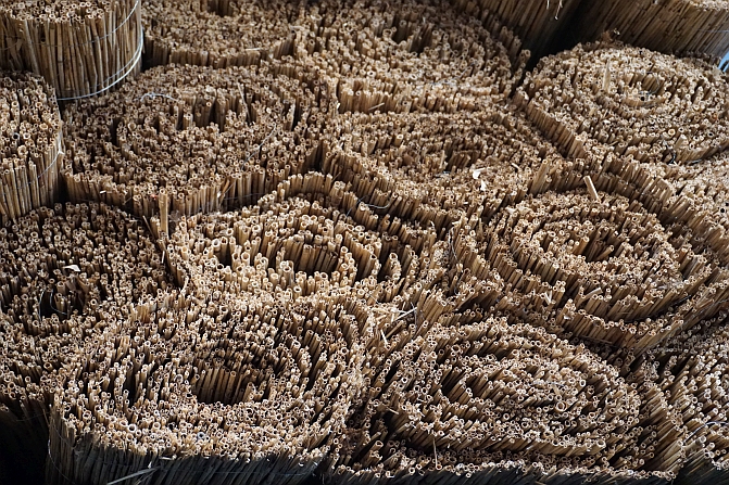 Rieten Mat op rol. De rieten mat is brandwerend behandeld om te kunnen gebruiken ook op evenementen of festival locaties.